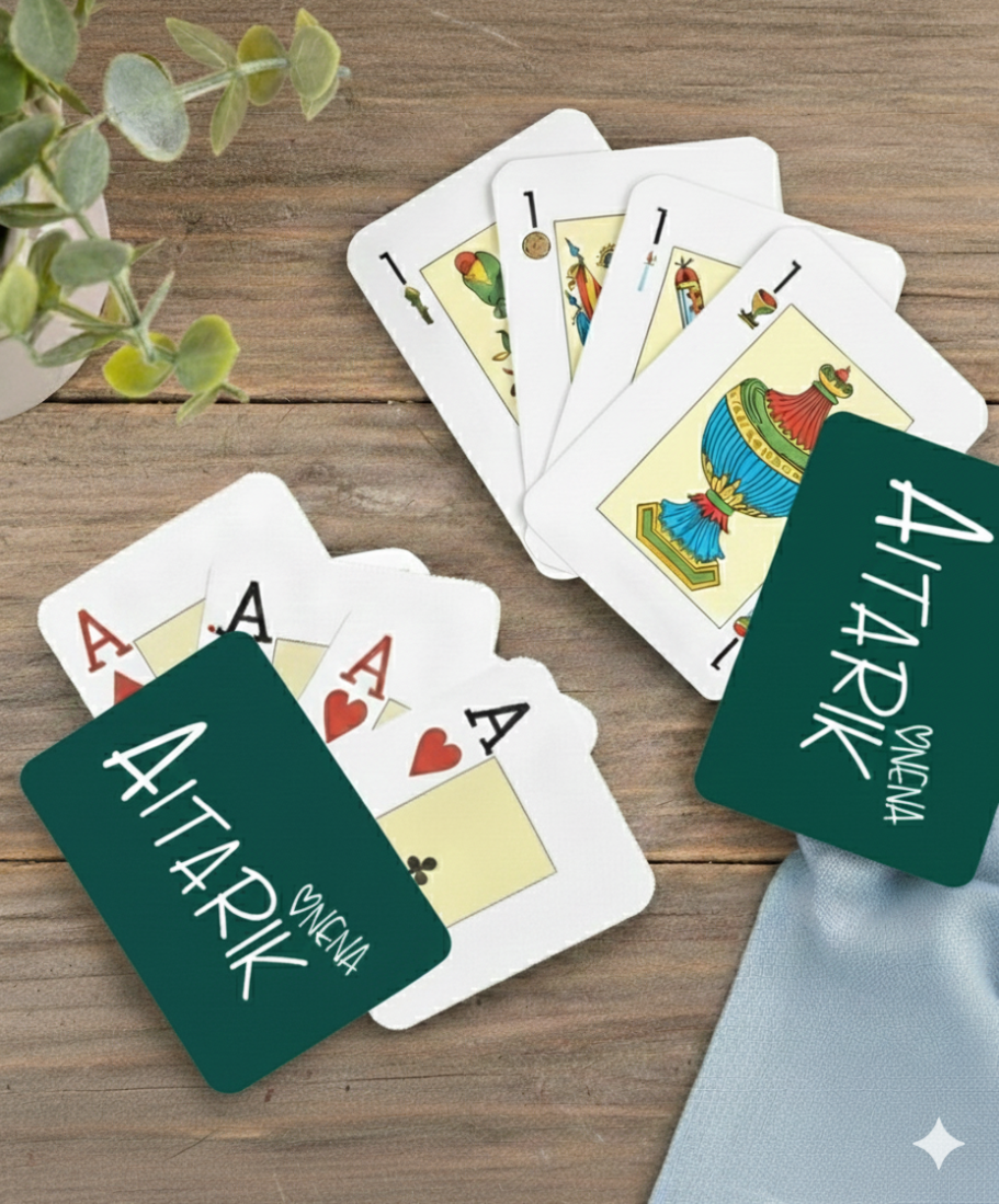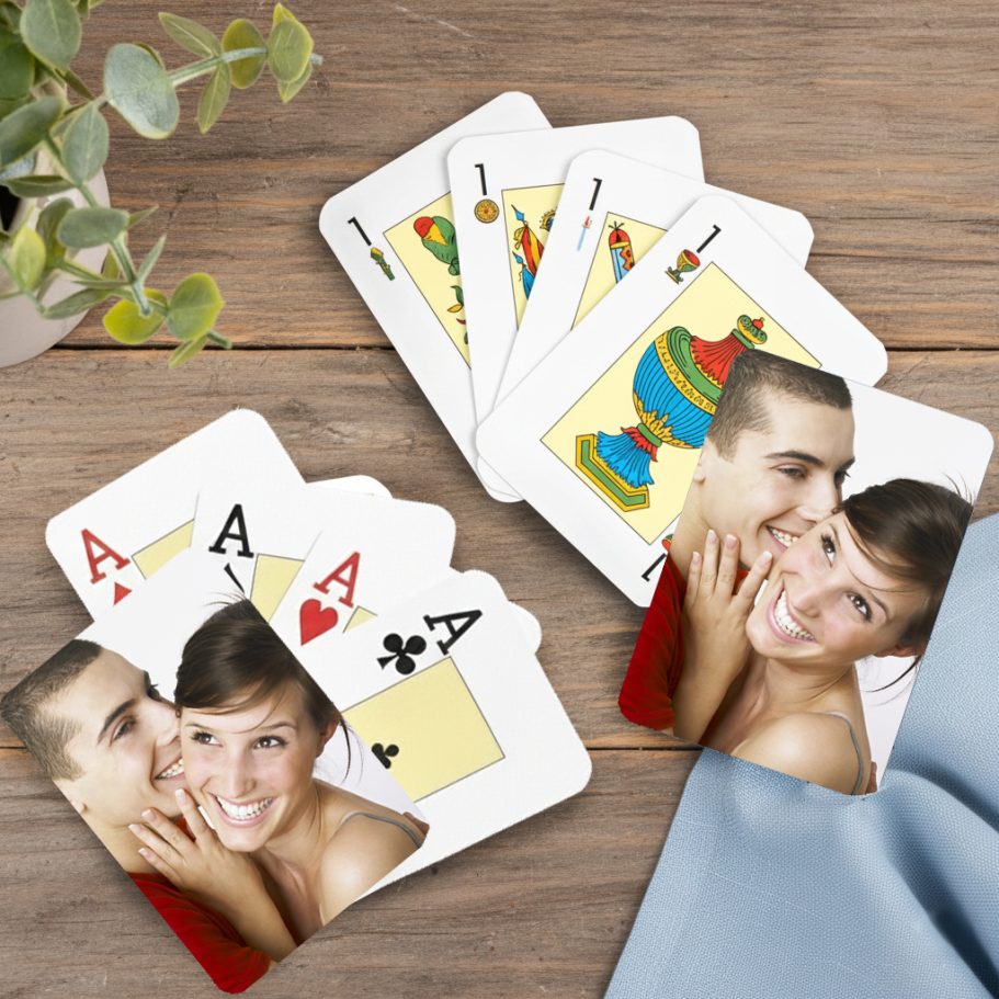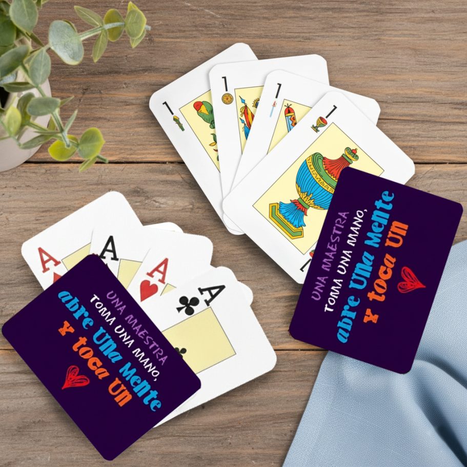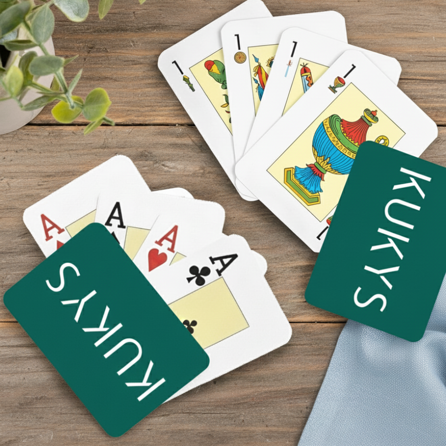 Elige entre: baraja española (48 cartas. Se compone de oros, copas, espadas y bastos) o francesa (55 cartas. Se compone de tréboles, picas, corazones y diamantes).