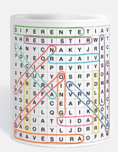 Es sólo una muestra. Antes de pagar ponte en contacto conmigo por teléfono o WhatsApp al 656 73 22 14 o por e-mail a contacto@kukys.es. Envíame envíame tus palabras. Te enviaré una fotografía para que veas cómo quedará y me des el OK y la insertaré en la taza que hayas elegido para que puedas pagarla y después la quitaré. Esta taza tiene un precio diferente por el trabajo de hacer la sopa de letras.