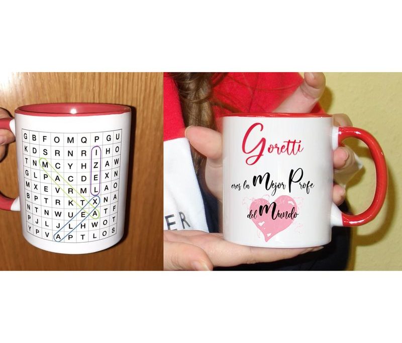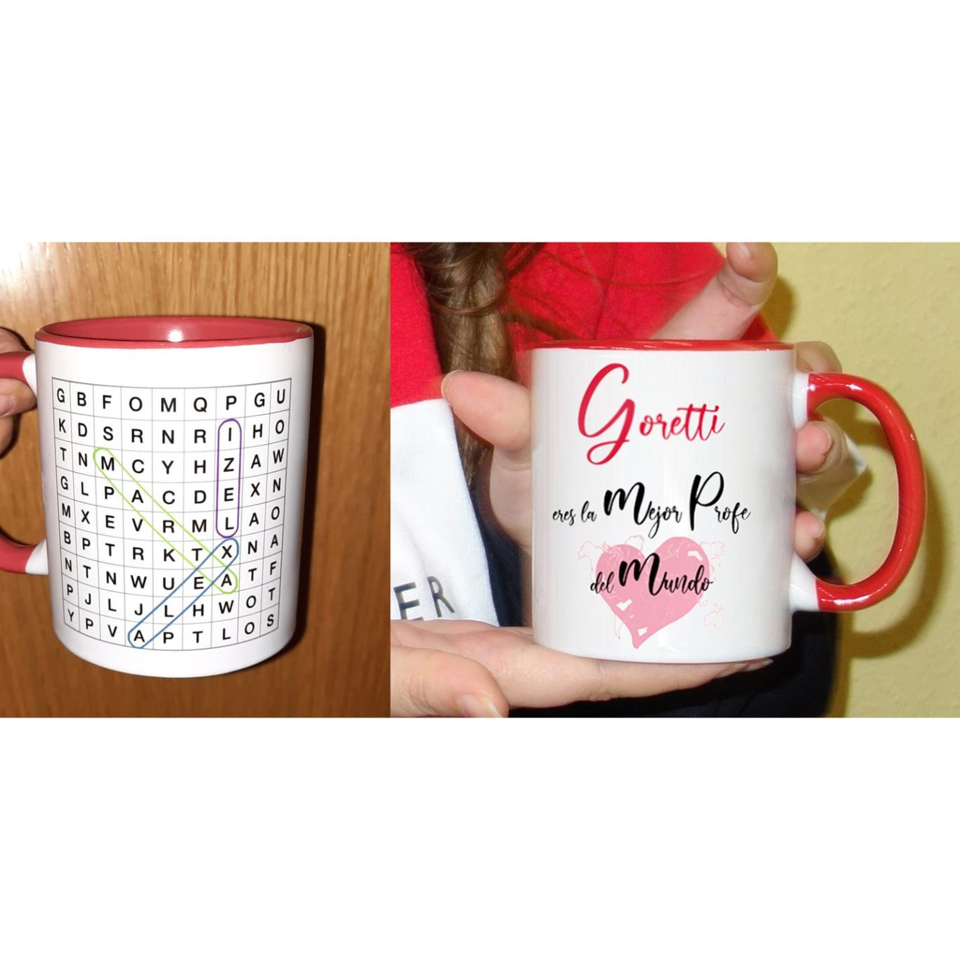 Tazas para PROFES. Con el nombre del o de la profe y de sus alumnos, en algunos modelos en una original sopa de letras; y con una emotiva frase .