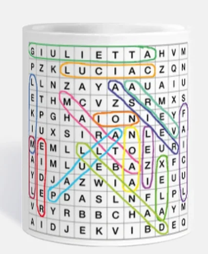 Es sólo una muestra. Antes de pagar ponte en contacto conmigo por teléfono o WhatsApp al 656 73 22 14 o por e-mail a contacto@kukys.es. Envíame envíame los nombres. TTe enviaré una fotografía para que veas cómo quedará y me des el OK y la insertaré en la taza que hayas elegido para que puedas pagarla y después la quitaré. Esta taza tiene un precio diferente por el trabajo de hacer la sopa de letras.