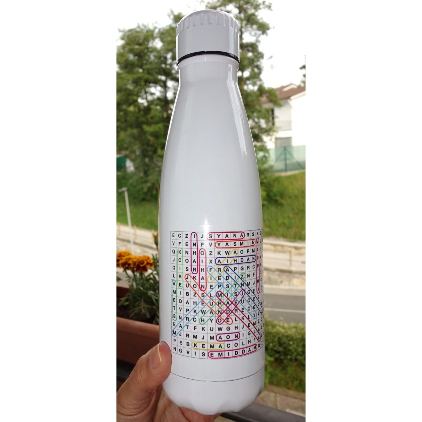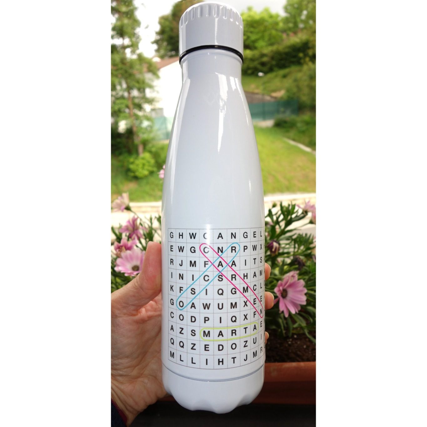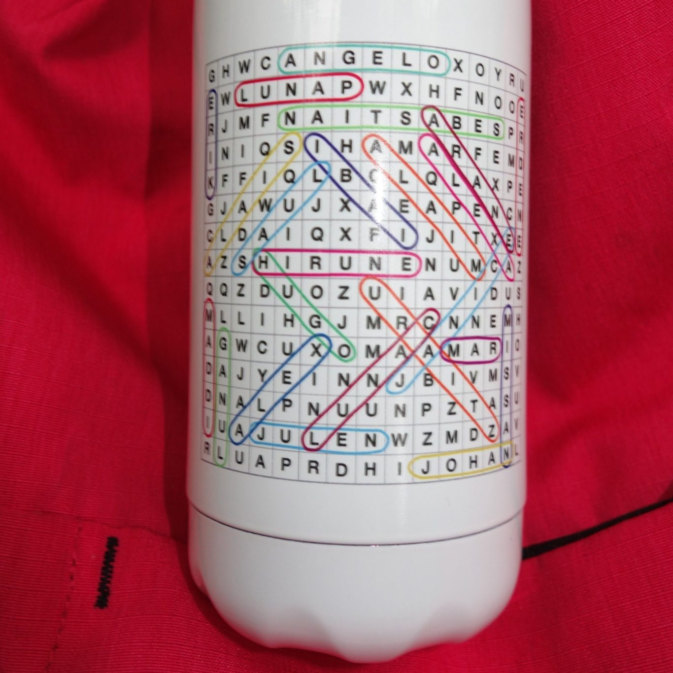 Fotografías de la botella que me han encargado para una profesora con una original sopa de letras con los nombres de sus alumnos.