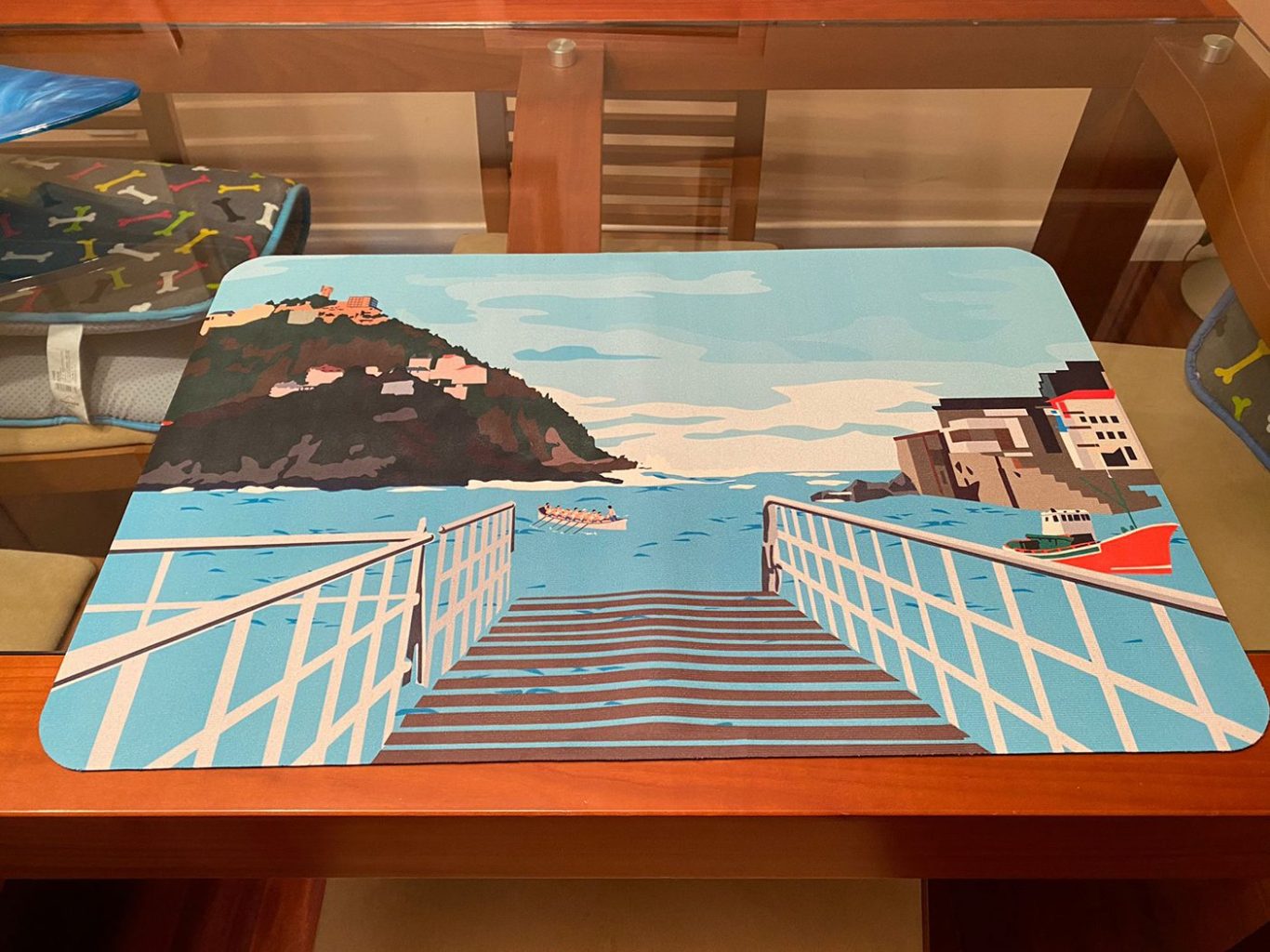 Fotografías con uno de los 2 SALVAMANTELES de diatomeas que me encargó Ana. Prácticos: absorbentes y no se mueven. Ana, cliente de Kukys nos ha enviado estas fotografías de su Salvamantel práctico de diatomeas "El Puerto de Donostia - San Sebastián" de 40 x 60 cm. Ana escribió comentó: "He comprado dos salvamanteles absorventes de diatomeas en Kukys.es y estoy muy contenta. Son geniales. Precioso dibujo del puerto de Donosti y son muy prácticos y de buena calidad. Es lo mejor para cuando no quiero poner el mantel grande. Prácticos, bonitos y con mucha personalidad. Buena compra, lo recomiendo".