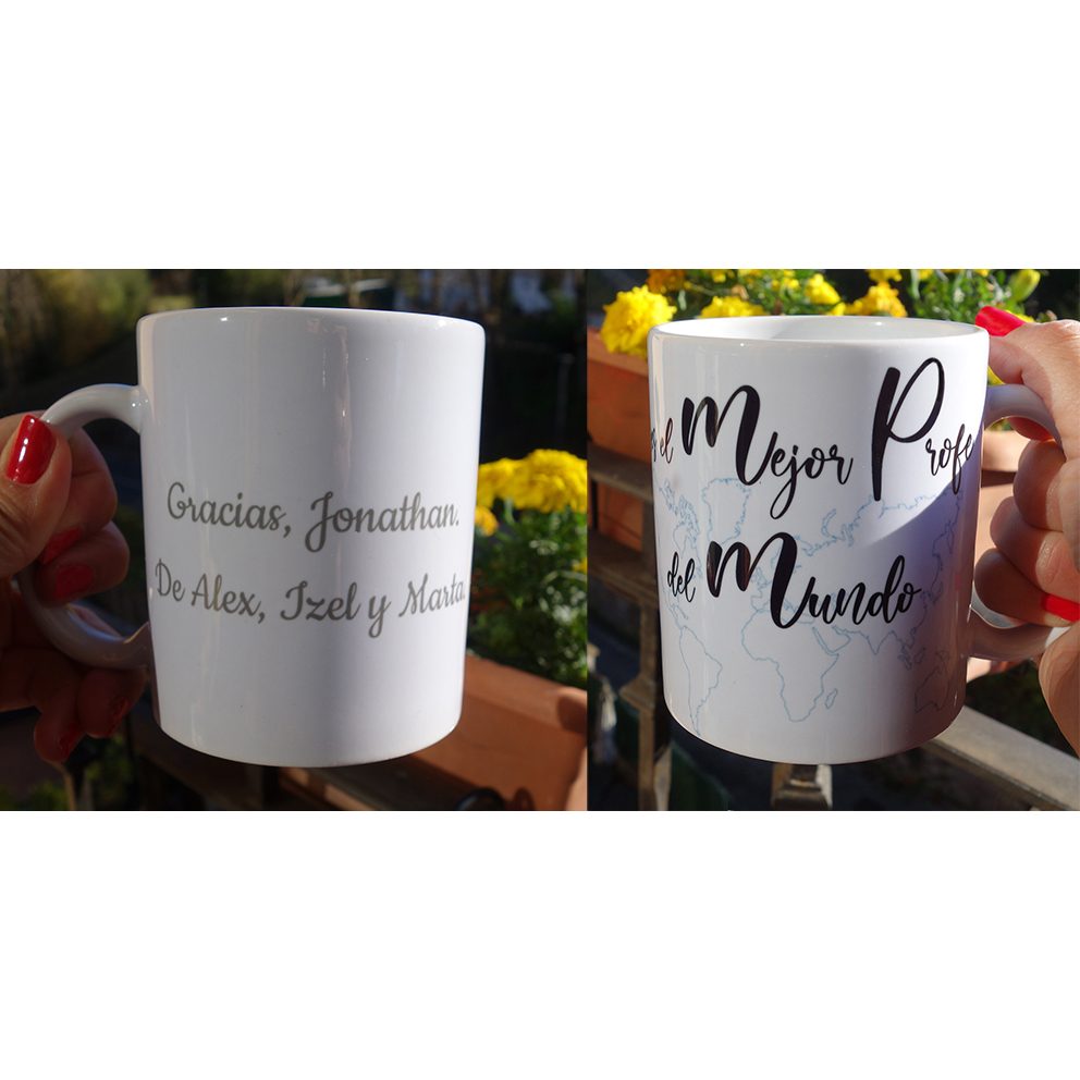 Fotografías de la taza que nuestros niños regalaron a su profesor particular en Navidad. Una persona con mucha paciencia, muy buen carácter y sobre todo un gran profesor. La vendemos en nuestra página dentro de la Tostadora (aquí pones tú mis@ los nombres del o de la profe y de sus alumnos) y en en esta página directamente (aquí yo le pongo los nombres, no tiene que hacerlo usted).