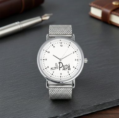 - Relojes analógicos con 3 manecillas y correa ajustable. Se personaliza la esfera, que es de acero inoxidable.