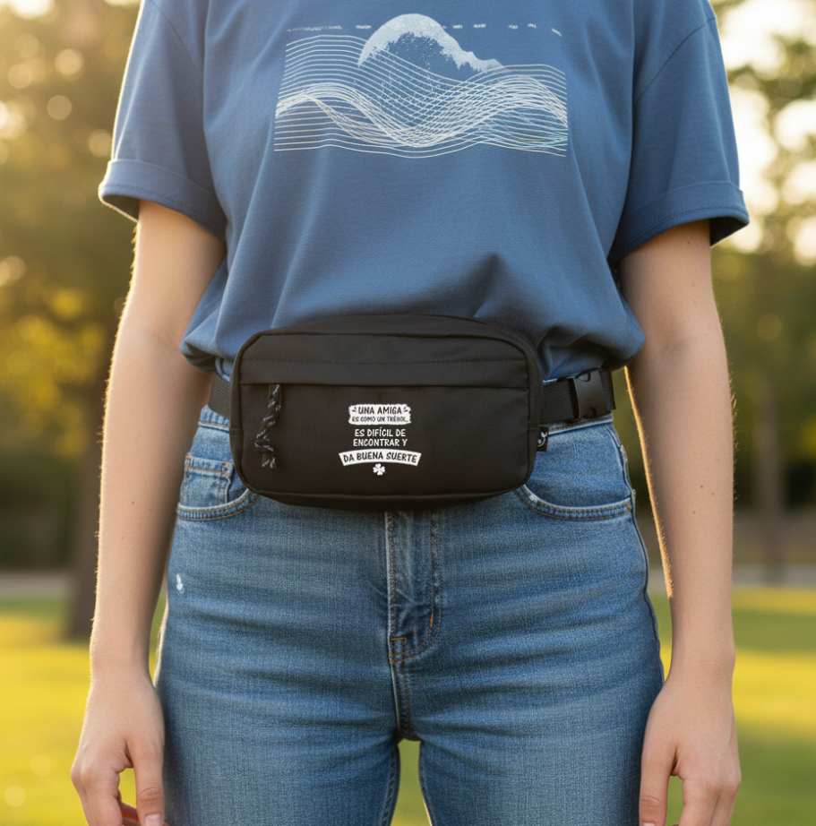 Compartimento principal amplio para guardar tu cartera, móvil, llaves o cosméticos y un bolsillo frontal para lo que quieras tener más a mano. Puedes llevarla en la cintura o cruzada en el pecho.