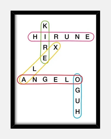 Es sólo una muestra. Antes de pagar ponte en contacto conmigo por teléfono o WhatsApp al 656 73 22 14 o por e-mail a contacto@kukys.es. Envíame envíame los nombres. Te enviaré una fotografía para que veas cómo quedará y me des el OK y la insertaré en el cuadro que hayas elegido para que puedas pagarlo. Este cuadro tiene un precio diferente por el trabajo de hacer la sopa de letras.