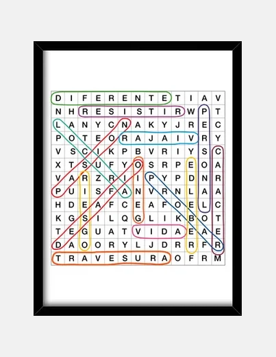 Es sólo una muestra. Antes de pagar ponte en contacto conmigo por teléfono o WhatsApp al 656 73 22 14 o por e-mail a contacto@kukys.es. Envíame envíame tus palabras. Te enviaré una fotografía para que veas cómo quedará y me des el OK y la insertaré en el cuadro que hayas elegido para que puedas pagarlo. Este cuadro tiene un precio diferente por el trabajo de hacer la sopa de letras.