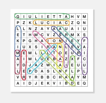 Es sólo una muestra. Antes de pagar ponte en contacto conmigo por teléfono o WhatsApp al 656 73 22 14 o por e-mail a contacto@kukys.es. Envíame envíame los nombres. Te enviaré una fotografía para que veas cómo quedará y me des el OK y la insertaré en el lienzo que hayas elegido para que puedas pagarlo. Este lienzo tiene un precio diferente por el trabajo de hacer la sopa de letras.